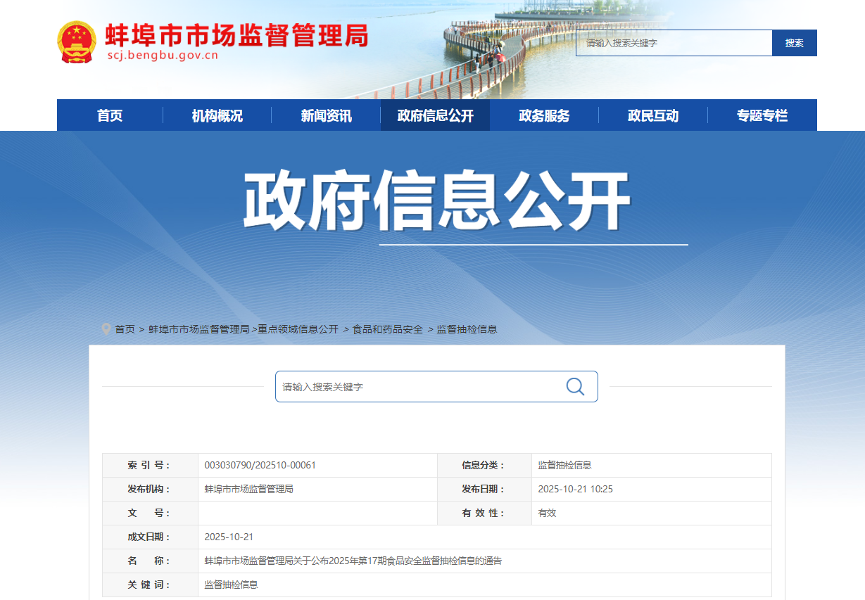 安徽省蚌埠市市场监督管理局关于公布2025年第17期食品安全监督抽检信息的通告