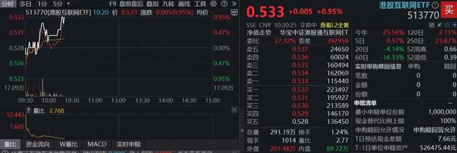 12月29日,港股AI走势活跃,重仓互联网龙头的港股互联网ETF(513770)震荡拉升,场内价格现涨 0.95%,盘中再现宽幅溢价,实时溢价率超0.3%。科网龙头多数飘红,哔哩哔哩-W涨超2%,美团-W、 快手-W涨逾1%,小米集团-W、阿里巴巴-W、腾讯控股跟涨。 | 分时 多日 1分 5分 · 0.533 | | F9 盘前盘后 酷加 九转 画纹 工具 (2 >> 513770[485百貨网EIF] 10:50 V 0.533 器器 0.002(0.92%) 用W | 0.959 | | 0 533 +0.005 +0.95% | | 港股互联网ETF C 工 | 513770 ~ | | --- | --- | --- | --- | --- | --- | --- | --- | --- | | | | | | | SSE CNY 10:20:25 交易中 查看L2全器 | | | 融之間日 | | 0.531 | | | 0.47% | 净值注册 | 华宝中证港股通互联网ET | 25 | 25.56% 120日 | 211% | | | | | | | 27:32% 委常 | 392956 5日 ...