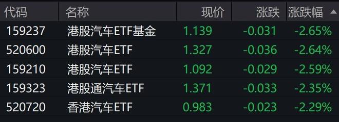 Core Viewpoint - The Hong Kong automotive sector is experiencing a decline, with major companies like Xpeng Motors, Li Auto, and Great Wall Motors seeing significant drops in their stock prices, impacting related ETFs as well [1][2]. Group 1: Stock Performance - Xpeng Motors-W fell over 4%, while Li Auto-W dropped over 2%, and both Leap Motor and Great Wall Motors saw declines exceeding 3% [1]. - The Hong Kong automotive-related ETFs also experienced a downturn, with declines of over 2% across various funds [1]. Group 2: Market Outlook - Analysts suggest that the automotive market is entering a consumption peak season, with expectations for continued growth in exports [2]. - The sector is viewed as having long-term stable investment value, with recommendations to focus on leading companies and those with low exposure to the U.S. market [2]. - The automotive sector is anticipated to enter a phase characterized by high sales momentum, event catalysts, and industry trend resonance [2].