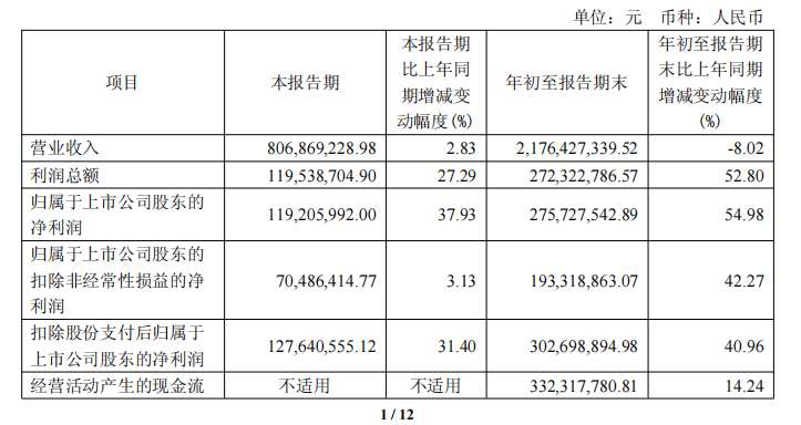 年初至报告期末,归属于上市公司股东的净利润更是实现54.98%的高增长,扣除非经常性损益的净利润同比增长42.27%,基本 每股收益与稀释每股收益同比增幅均超37%,盈利规模与盈利质量同步提升。 | | | | 单位: 元 | 币种:人民币 | | --- | --- | --- | --- | --- | | | | 本报告期 | | 年初至报告期 | | 项目 | 本报告期 | 比上年同 | 年初至报告期末 | 末比上年同期 | | | | 期增减变 | | 增减变动幅度 | | | | 动幅度(%) | | (%) | | 营业收入 | 806,869,228.98 | 2.83 | 2.176.427.339.52 | -8.02 | | 利润息额 | 119.538.704.90 | 27.29 | 272,322,786.57 | 52.80 | | 归属于上市公司股东的 | 119,205,992.00 | 37.93 | 275,727,542.89 | 54.98 | | 净利润 | | | | | | 归属于上市公司股东的 | | | | | | 扣除非经常性损益的净 | 70.486.4 ...