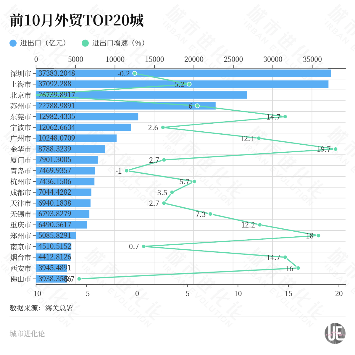 据广州海关统计,今年前10月,广州市外贸进出口总值达1.02万亿元,创下历史同期新高,同比增长12.1%。其中,出口6823.6亿元,同比增长20.5%,增速 居全国主要(前十)外贸城市首位、广东省21个地市首位。 具体来看,今年前10月,广州市对其他RCEP成员国进出口2925亿元,同比增长11.6%。同期,广州市对欧盟、东盟的进出口值分别为1825.4亿元、1696.3亿 元,同比分别增长23.9%、31.1%;对共建"一带一路"国家进出口4796.1亿元,同比增长24.1%;对其他金砖成员国和伙伴国进出口2559.6亿元,同比增长 22.5%。 民营企业是广州外贸"主力军"。今年前10月,广州市有进出口实绩的企业超过2.7万家,同比增长12.5%。其中,民营企业数量超过2.4万家,在有进出口实绩 企业总数中占比达87.3%。今年前10月,广州市民营企业进出口6207.5亿元,同比增长20.3%,占同期广州市外贸总值的60.6%。 解读:去年广州外贸规模突破万亿元,用时11个月,今年则是再度提速,外贸规模历史上首度在前10月突破万亿元,为全省外贸增速贡献1.5个百分点。 具体来看,今年前10月,广东外贸进 ...