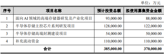 北京商报讯(记者 陶凤 王天逸)12月2日,深圳市江波龙电子股份有限公司发布2025年度向特定对象发 行A股股票预案,拟募集资金总额不超过37亿元,用于面向AI领域的高端存储器研发及产业化、半导体 存储主控芯片系列研发、半导体存储高端封测建设以及补充流动资金。 公告显示,本次募集资金将主要用于四大项目:一是面向AI领域的高端存储器研发及产业化项目,拟 投入8.8亿元;二是半导体存储主控芯片系列研发项目,拟投入12.2亿元;三是半导体存储高端封测建设 项目,拟投入5亿元;四是补充流动资金,拟投入11亿元。 公司指出,随着人工智能、云计算等下游应用快速发展,存储市场需求激增,尤其是AI服务器对高性 能存储器的需求显著提升。通过本次募资,江波龙将进一步强化在高端存储器、主控芯片及封测环节的 技术实力,提升产业链自主可控能力,巩固其在半导体存储行业的领先地位。 ...