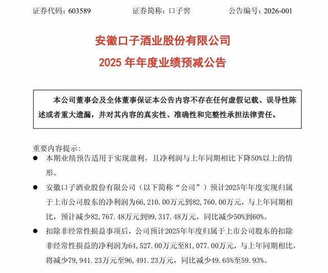 口子窖发预减,预计2025年度归母净利润6.62亿元到8.28亿元,同比减少50%到60%