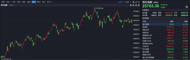 截至收盘,恒生指数报收于25765.36点,下跌319.72点,跌幅1.23%。 | 和加 · 其他 · 黑 / : 恒生指数 (HSI) | 80 6日 . 69 159 308 609 日照 周K 月K #K . | 幅生積数 相談 * | 25765.36 +33 | 00000 | | | | | --- | --- | --- | --- | --- | --- | --- | --- | | +-27381.84 | 行情报价 | 27000.0 | 20067.88 | 120亿 重高 20151.44 9开 | 成交量 | | | | 成交部 | 2002亿 服情 | 25755.01 昨夜 | 20085.08 | 0 DOSDO D | 他用質 | | | | 图 81 | 准确 | 18.80 | -0.11% | 新元相對 | 24/500 0 | | | | 47954.89 | +0.221 | US BE | 25000.0 | M斯达克 | +0.315 | 21578.12 | | | 89.98500 | +0.117 | 8170.40 | 24500.0 | 美国旗时1 ...