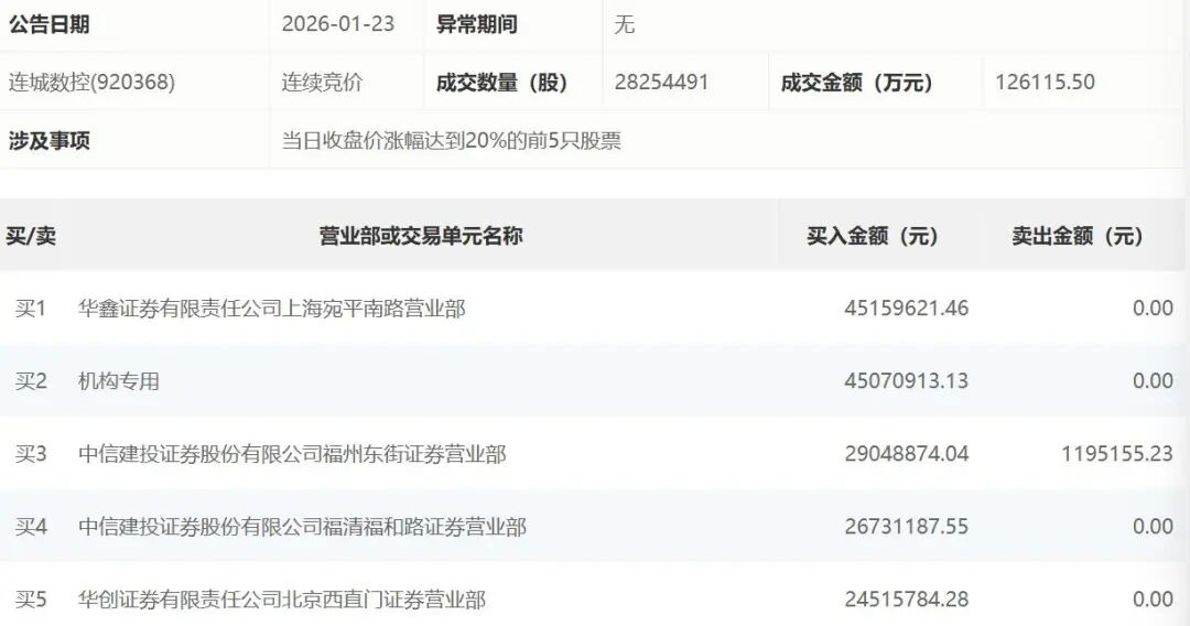 值得一提的是,连城数控的卖出榜五也为机构专用席位,该机构今日合计卖出1302万元,与此同时,今日该机构买入了连城数控95万元。 资料显示,连城数控是处于光伏及半导体高端装备制造领域的集成服务商,拥有国家级高新技术企业资质、省级技术研究中心及实验室的科研平台、大连 —无锡—美国—越南四大研发生产基地等核心资源,以及数百项专利技术等软实力,为全球光伏企业及半导体材料制造商提供高精度、高效率的设备及整 线交付解决方案。2025年上半年,公司来自关联方隆基绿能营业收入占公司总营业收入的比例为33.53%。 近日,A股"太空光伏"概念股火了,北交所2只个股欧普泰和连城数控,于1月23日双双强势封涨停;A股主板的隆基绿能(601012)午后也封涨停。 欧普泰和连城数控,均因股价涨停登上今日北交所"龙虎榜",且连城数控获得机构大手笔买入。 据北交所今日盘后披露,连城数控的买入榜一为华鑫证券有限责任公司上海宛平南路营业部,合计买入4516万元;榜二为机构专用席位,该机构今日共买 入4507万元。买入榜前两位今日卖出金额均为0。 | 公告日期 | 2026-01-23 异常期间 | 无 | | | | --- | --- | ...