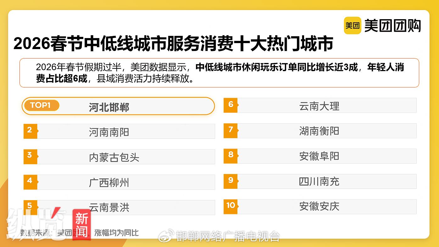 邯郸春节文旅市场"热力全开" 春节假期,邯郸推出12项重点活动、百场精品演出及30项暖心服务,以"文化+体验+福利"为核心,串联传统与现代,尽显邯郸历史底蕴与城市温情。 围绕"骐骥跃邯郸 古都邀你过大年"主题,邯郸为市民游客端上了一份年味十足的"文旅大餐"。从再现曹魏风骨的裸眼3D沉浸式演出《邺都长歌》,到邯郸 道历史文化街区汇聚的赵奢战鼓、英歌舞巡游,再到广府古城上演的水上太极秀,十二大重点活动将古都的历史文脉与现代演艺巧妙融合。 2026春节中低线城市服务消费十大热门城市。(来源/美团) 除了中心城区的热闹,县域旅游同样亮点纷呈。临漳县以"民俗焕新·年味延续"为主题,将高跷、撵花等非遗技艺集体出街上演 ,让千年邺城的年俗记忆 在现代都市中"活"了起来。肥乡区深挖本土资源,梅花拳非遗交流会与女子舞龙表演轮番登场,展现了乡土文化的蓬勃生命力。大名县更是推出了500余场 活动,巨型七彩麒麟气球巡游与"飞天秀"交替上演,让传统民俗与现代创意碰撞出火花。 (来源:邯郸网络广播电视台) 转自:邯郸网络广播电视台 春节假期小城服务消费火热,邯郸成消费热门小城TOP1,12项重点活动、百场演出尽显历史底蕴 2026年春节 ...