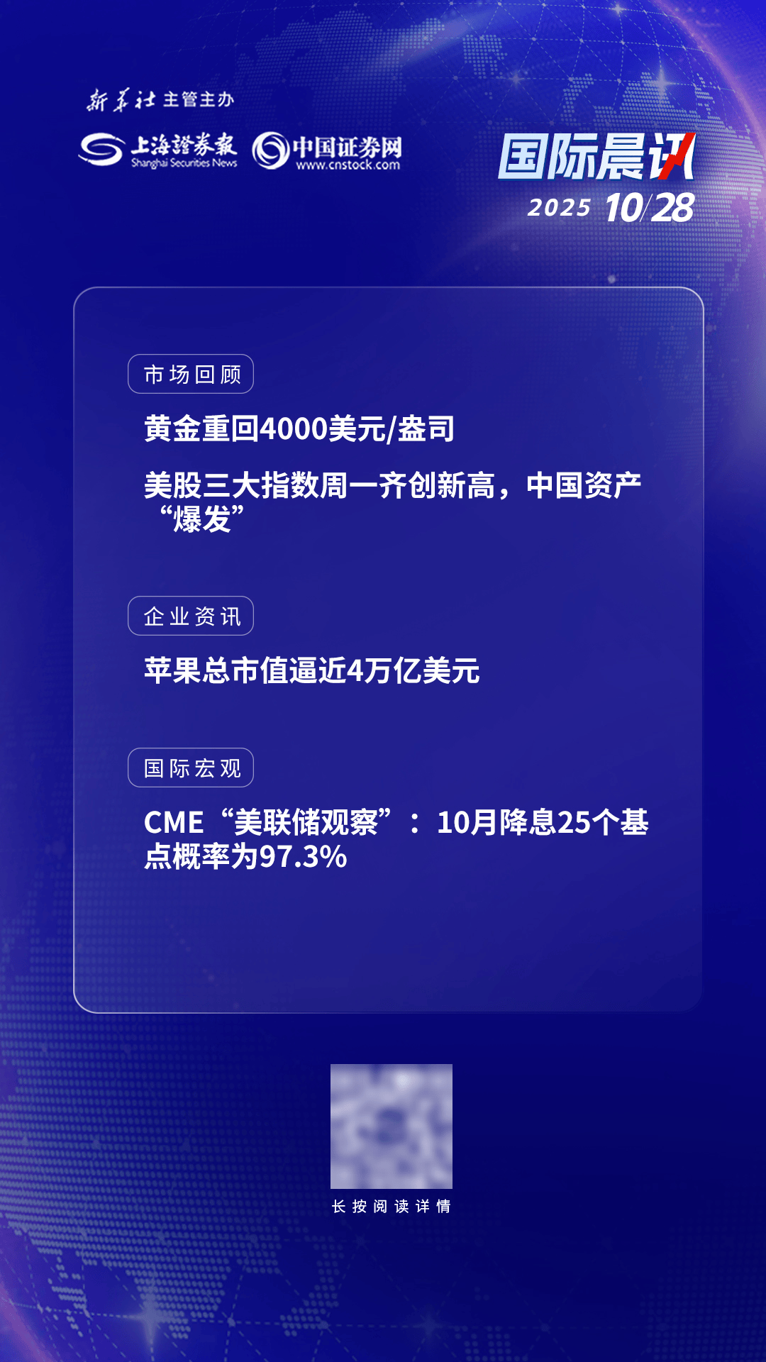 10月28日国际晨讯丨黄金重回4000美元/盎司 苹果市值逼近4万亿美元