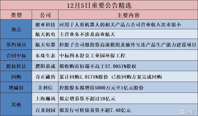 | | | 12月5日重要公告精选 | | --- | --- | --- | | 类型 | 公司 | 主要内容 | | 热点 | 骏亚科技 | 应用于人形机器人的相关产品占公司营业收入比重很小 | | | 航天机电 | 主营业务不涉及商业航天 | | 签约项目 | 航天电器 | 控股子公司拟投资高速模组及液冷互连产品生产能力建设项目 | | 合同中标 | 东珠生态 | 中标图木舒克工业园环保工程 | | 股权转让 | 濮阳惠成 | 拟收购雷佰瑞不高于37.0051%股权 | | 回购 | 奇正藏药 | 累计回购1.0175%股份 已按回购方案完成回购 | | 增减持 | 美利信 | 控股股东拟增持5000万元至1亿元股份 | | 其他 | 上海瀚讯 | 拟定增募资不超过10亿元 | | | 百龙创园 | 拟发行可转债募资不超7. 48亿元 日開發[ | 【热点】 ST太重(600169.SH):拟将太重焦化公司100%股权出售给控股股东太重集团 江南化工(002226.SZ):拟收购庆华民爆100%股份 濮阳惠成(300481.SZ):拟收购雷佰瑞不高于37.0051%股权 顺控发 展(003039.SZ) ...