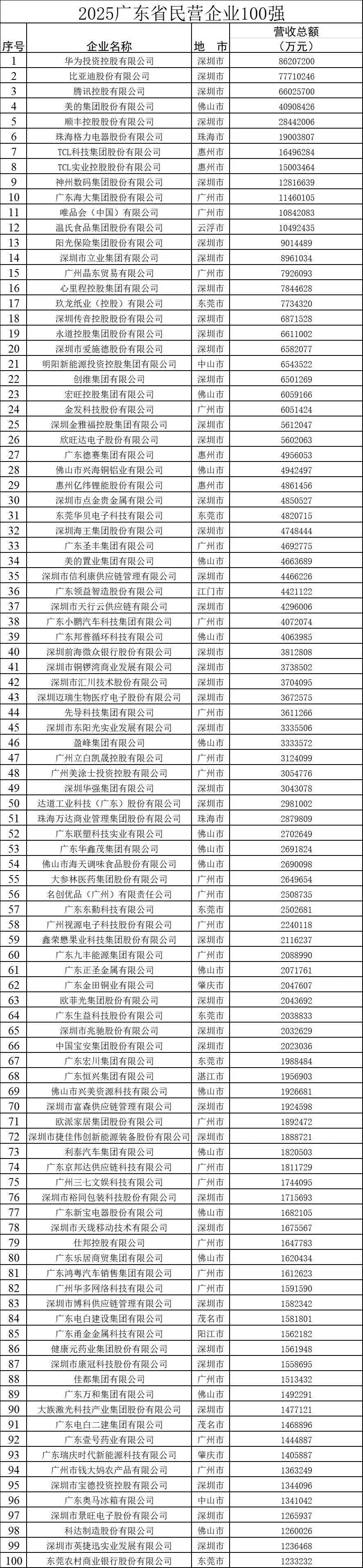 【深商】 一切与深圳商业相关。 含深量很高 40家深企上榜2025广东民企百强 9月29日,广东省工商业联合会(总商会)在世界粤商大会现场发布"2025广东省民营企业百强"榜单,其中40家企业来自深圳,超过排名第二、第三城市 的总和。 华为、比亚迪、腾讯三家深圳企业包揽前三强,并且排名前50的企业中有25家来自深圳,占比达50%。数据让人直观感受深圳民营企业高质量发展的生动 实践。 据悉,榜单由企业自愿申报并以2024年企业营业收入为基本标准,以企业会计年表为依据,经有关部门审核排序产生。 由深圳总部企业中建科工旗下 中建钢构参建的匈塞铁路 塞尔维亚境内诺维萨德 至苏博蒂察段(诺苏段)建成通车 2025广东省民营企业100强榜单入围门槛为123.32亿元,其中2024年营业收入超过4000亿元的企业有4家(分别为华为、比亚迪、腾讯及美的),超1000亿 元的有12家,超200亿元的有66家。地区分布情况为:深圳40家、广州22家、佛山16家、东莞6家、惠州4家,珠海、中山、茂名、肇庆各2家,江门、阳 江、湛江、云浮各1家。 同时发布的还有"2025广东省制造业民营企业100强"和"2025广东省服务业民营企业 ...
