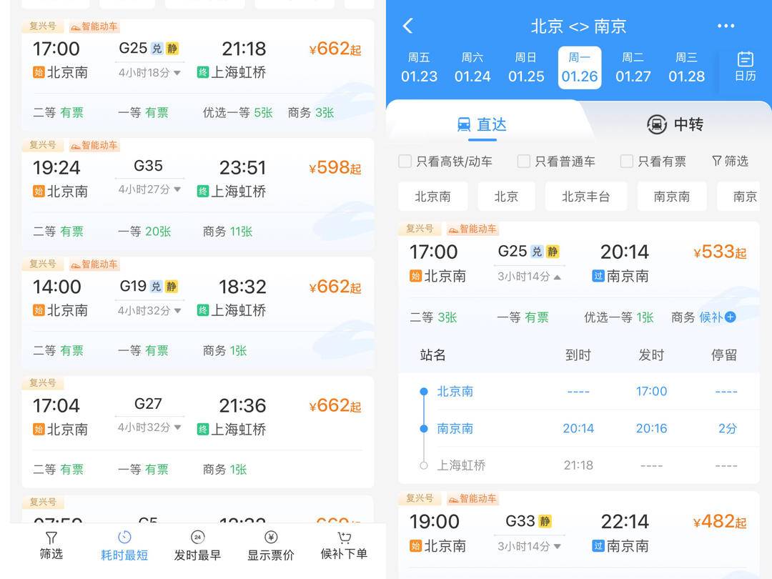自1月26日起,全国铁路将实行一季度新的列车运行图。此次调图后,图定旅客列车较现图增加243列,货物列车增加177列。此次全国铁路一季度运行图 的调整,通过增开列车、优化路径、压缩时间、打通新线,切实提升了铁路运输服务品质和效率。对于江苏居民来说,无论是北上进京、东行赴沪,还是 南下粤港,都将享受到更加快捷、便利的出行体验,江苏与全国各地的时空联系也因此变得更加紧密。 京沪高铁G25次中途唯停南京南 全程缩至4小时18分 | 复兴号 ≥智能动车 | | | | V | | 北京 <> 南京 | | | | --- | --- | --- | --- | --- | --- | --- | --- | --- | | 17:00 | G25 兑 静 | 21:18 | ¥662起 | 周五 周六 | 周日 | 周一 | 周二 | 周三 E | | 给北京南 | 4小时18分▼ | 终上海虹桥 | | 01.23 01.24 01.25 | | | 01.26 01.27 01.28 | 日历 | | 二等 有票 | 一等 有票 | 优选一等 5张 | 商务 3张 | | | | | | | | | | | 國 ...