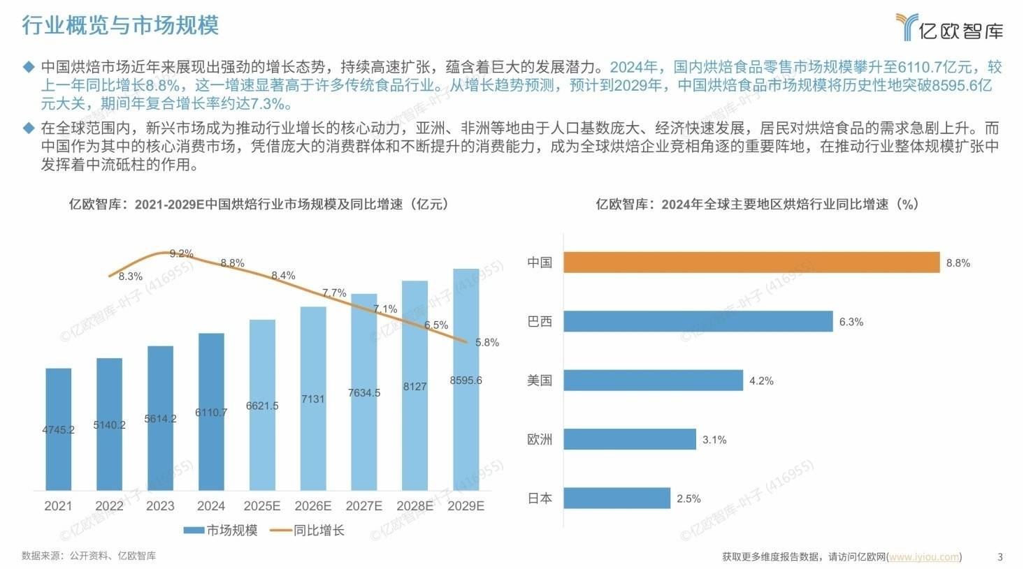 随着消费升级浪潮的持续推进,中国烘培市场正展现出强劲的增长势头,根据行业统计显示,2024年国内烘培食品零售市场规模已达6110.7亿元,较去年同 比增长8.8%,预计到2029年将突破8595.6亿元。在这快速扩张的市场背景下,两大消费趋势正深刻影响着行业的发展方向:一是健康化,二是零食化与代餐 化,这两大趋势共同推动着行业从产品创新到消费场景的全面升级。 健康化趋势引领产品创新 目前,消费者对健康饮食的追求正在重塑烘培行业格局,烘焙食品正在从传统的高糖、高脂肪配方,向低糖、低脂、高纤维方向转型。据预测,2025年健康 烘焙市场规模有望达到300亿元、年增速高达28.6%,展现出强势头的发展潜力。欧包、贝果等健康品类持续受到健身人士和年轻白领的青睐,部分品牌也 逐渐推出融合中式特色的健康产品,将传统食材与健康理念相结合,这标志着如今健康化已成为驱动行业创新不可或缺的重要力量。 所以在这一趋势的引领下,苏州稻香村也在积极推动产品创新,其推出的15天短保碧螺春茶酥,通过精准控温技术确保产品新鲜度,充分满足消费者的"短 保"需求;坚果桃酥在延续传统风味的同时,优化了口感层次,更强化了营养功能,精准契合现代健康的饮 ...