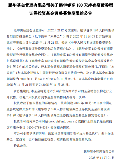 中国经济网北京11月3日讯近日,鹏华基金管理有限公司发布关于鹏华睿享180天持有期债券型证券投资 基金调整募集期限的公告。 公告称,鹏华睿享180天持有期债券型证券投资基金将于2025年11月3日开始募集,原定募集截止日为 2025年11月21日。现决定将该基金的募集期调整为2025年11月3日至2025年11月26日,即该基金的募集 截止日由2025年11月21日变更为2025年11月26日。 该基金拟任基金经理王石千2014年7月加盟鹏华基金管理有限公司,历任固定收益部高级债券研究员、 债券投资一部基金经理、副总经理/基金经理。现担任多元资产投资部总经理/基金经理。 ...