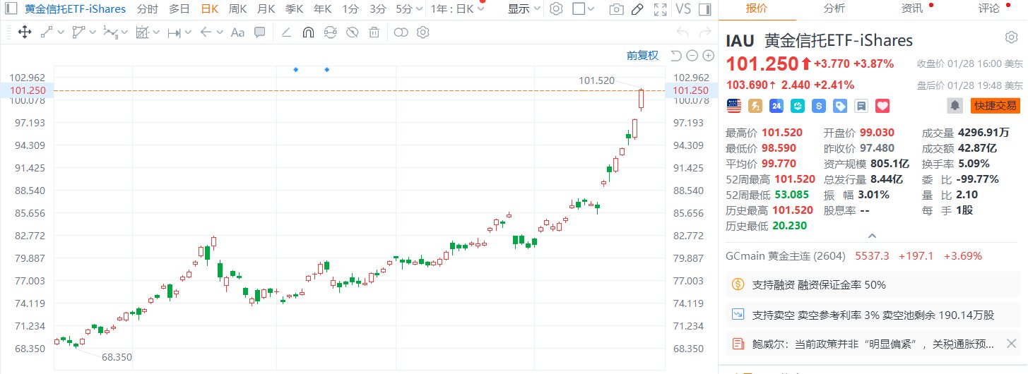 美股异动丨黄金信托ETF涨近4%,现货黄金一逼近5600美元+华尔街认为5000美元是新常态的起点