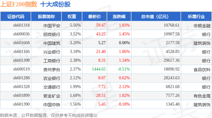 证券之星消息,11月25日,上证F200(000098)指数报收于5460.31点,涨0.79%,成交1643.15亿元,换手率0.44%。当日该指数成份股中,上涨 的有126家,中金黄金以4.15%的涨幅领涨,下跌的有59家,南钢股份以2.86%的跌幅领跌。 上证F200(000098)指数十大成份股详情如下: | 代码 | 名称 | 主力净流入(元) | 主力净占比 游资净流入 (元) | | 游资净占比 散户净流入(元) | | 散户净占比 | | --- | --- | --- | --- | --- | --- | --- | --- | | 603799 | 华友钻业 | 3.00 Z | 6.98% | -4634.49万 | -1.08% | -2.54 Z- | -5.90% | | 601988 | 中国银行 | 2.18亿 | 8.09% | -1.16 Z | -4.31% | -1.02 Z | -3.79% | | 601600 中国铝业 | | 2.08亿 | 7.71% | -7064.11万 | -2.62% | -1.37 Z | -5.08% | | 601398 | 工 ...