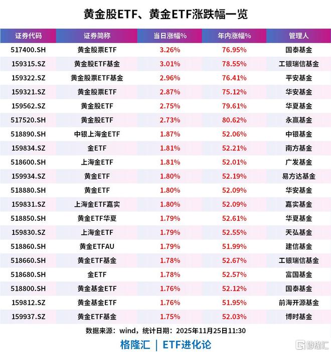 截至午盘黄金股票ETF、黄金股ETF基金涨超3%;黄金股票ETF基金、黄金股票ETF、黄金股ETF涨超 2.7%;中银上海金ETF、金ETF、上海金ETF、黄金ETF、上海金ETF嘉实、黄金ETF华夏、黄金 ETFAU、黄金ETF基金、黄金基金ETF、黄金ETF基金涨超1.7%。 | 证券代码 | 证券简称 | 当日涨幅% | 年内涨幅% | 管理人 | | --- | --- | --- | --- | --- | | 517400.SH | 黄金股票ETF | 3.26% | 76.95% | 国泰基金 | | 159315.SZ | 黄金股ETF基金 | 3.01% | 78.55% | 工银瑞信基金 | | 159322.SZ | 黄金股票ETF基金 | 2.96% | 76.41% | 平安县金 | | 159321.SZ | 黄金股票ETF | 2.87% | 75.12% | 华安县金 | | 159562.SZ | 黄金股ETF | 2.75% | 79.61% | 花直直等 | | 517520.SH | 黄金股ETF | 2.73% | 80.62% | 永康县金 | | 518890.S ...