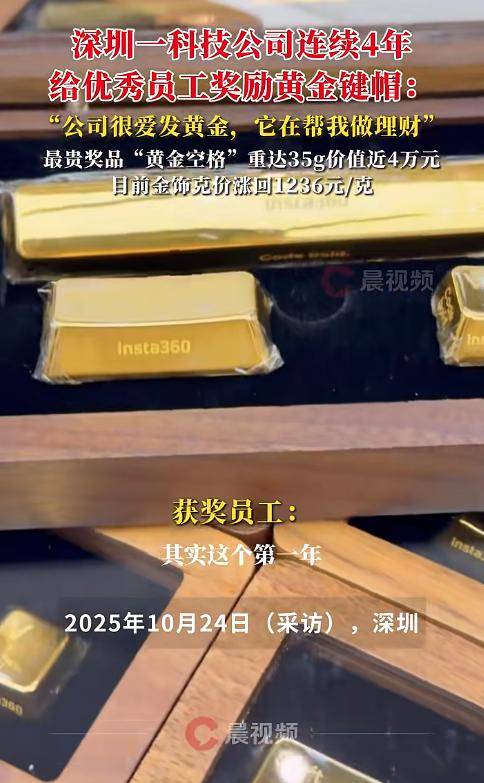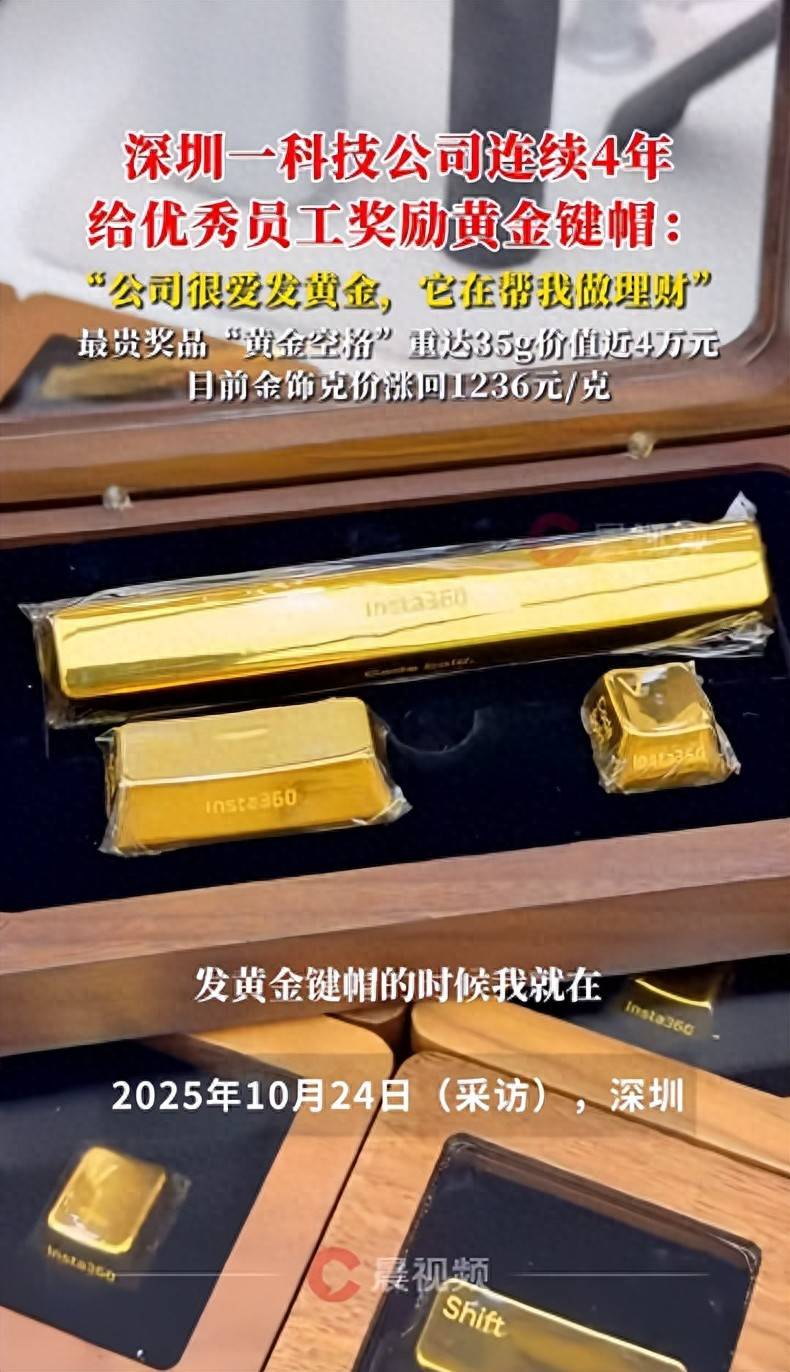 (来源:晨视频、潇湘晨报) 她还表示:"公司很爱发黄金,对于员工来说,非常实用,就像在帮我做固定理财。"据悉,最贵奖 品"黄金空格"重达35g价值近4万元,目前金饰克价涨回1236元/克。 深圳一科技公司连续4年给优秀员工奖励黄金键帽,公司获奖员工称:"已经等了3年,第一年发黄金键 帽的时候我就在,当时也很希望自己能拿,每一年都在努力,今年终于有机会拿到了。" ...