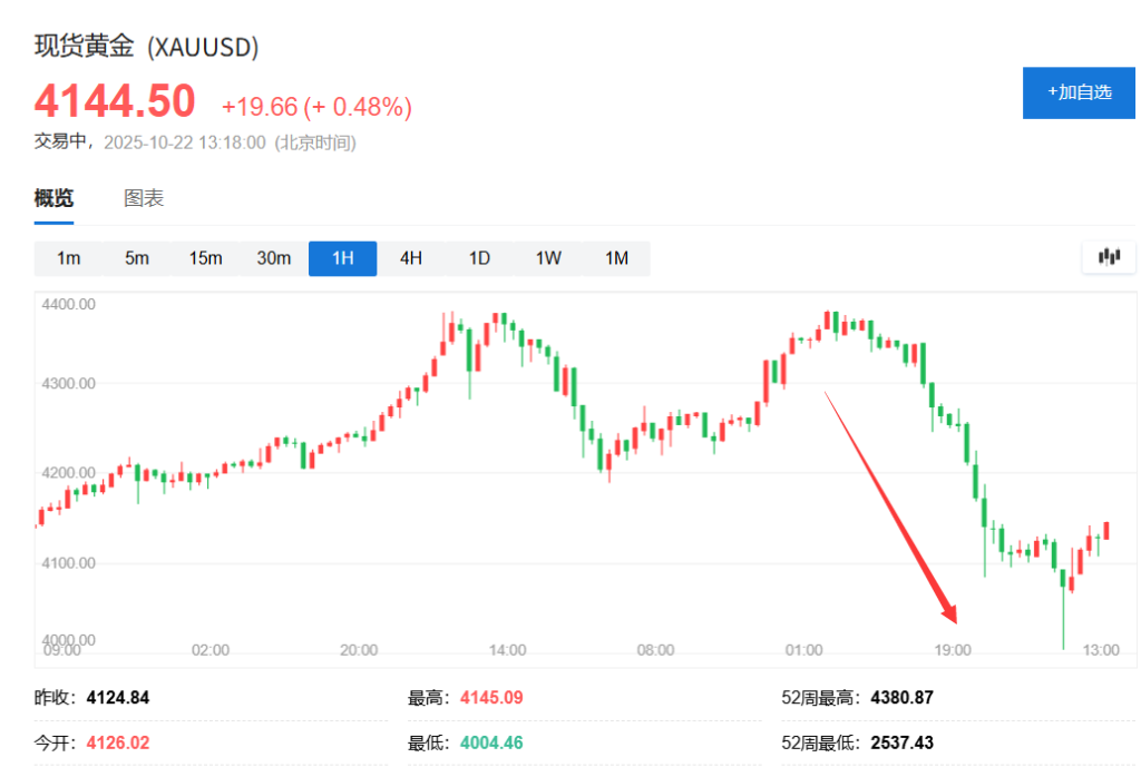 倒计时 3 天!2026 见闻历早鸟价 99 元(原价 139 元),7*24 财经日程助手不容错过,点击下图,即刻拥有! 连续数周的强劲涨势戛然而止,昨日金银市场经历了惊心动魄的一天。 10月21日周二,现货黄金价格盘中一度暴跌6.3%,逼近4000美元关口,创下逾12年来最大单日跌幅,这一波动被视为"5西格玛"(5 sigma)级别的罕见事 件。 现货白银跌幅更甚,一度下挫8.7%。这轮突如其来的抛售终结了此前一周金银价格连创历史新高的势头。高盛交易员评价道: 黄金走势图看起来就像一只崩盘的"妖股"(meme stock)。 | 概览 | 图表 | | | | | | | | | | | | --- | --- | --- | --- | --- | --- | --- | --- | --- | --- | --- | --- | | 1m | 5m | 15m | 30m | 1H | 4H 1D | | 1W | 1M | | | 1918 | | 4400.00 | | | | | | | | | | | | | 4300.00 | | | | | | | | | | | | | 4200.00 ...