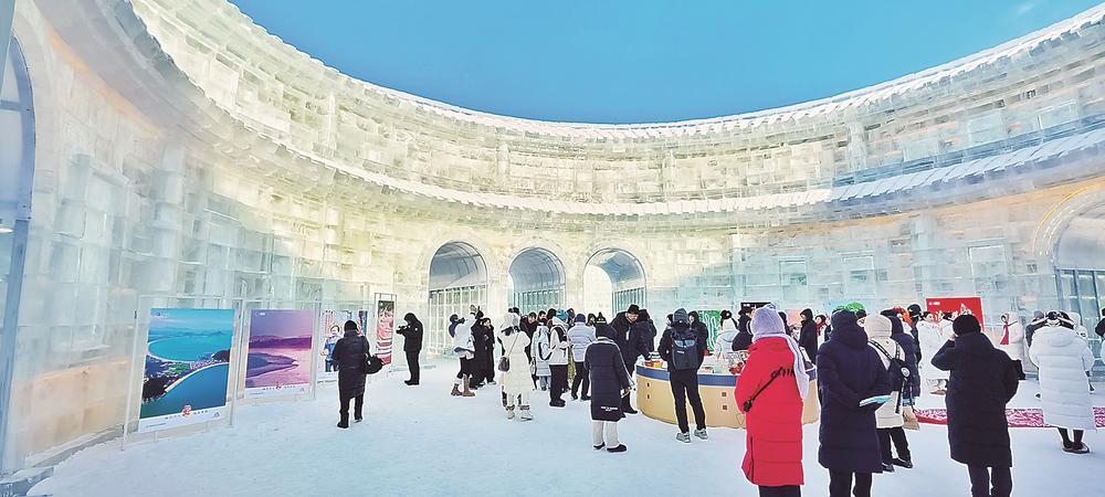 冰雕土楼内游客盈门。 福建木偶表演者在冰雕土楼前与游客互动。 一座土楼冰雕,演绎山海交响 小寒节气刚过,呵气成霜的哈尔滨冰雪大世界里充盈着欢乐和温暖的气息。冰雪与光影交织而成的"梦幻王国"中央,一座晶莹剔透的巨型冰雕 土楼拔地而起,惊艳了世人。红底黄字的"福建土楼"四字下,上联"福建福州福清福鼎福安八闽洪福"、下联"诏安同安华安永安惠安四季平 安"及横批"长乐泰宁"堪称点睛之笔。 福建是全国唯一一个名里带"福"字的省份。这副"最福建"的对联,巧用福建地名,让福建人感觉自信,让他乡客感觉吉庆。 作为福建最具知名度和代表性的文化符号之一,世界文化遗产"福建土楼"被誉为"中国建筑史上的一朵奇葩"。此次哈尔滨国际冰雪节,当地冰 雕艺人用精湛的技艺对土楼进行了艺术重构,让福建的绿水青山完美复刻在了北国的冰天雪地里。哈尔滨冰雪大世界里不乏大型冰雕建筑,但 冰雕土楼凝练了独特的闽派风韵,每一方水晶般透亮的冰砖之中似乎都吸收了人与自然和谐共生的营造智慧。连日来,它迅速成为游客争相打 卡的热门点位。 阳光透过晶莹的冰砖,在土楼内折射出五彩的光影。"浪花慕雪白 乐享福年来"福建文旅主题图片展在冰雕土楼内外同步拉开帷幕,围绕"交换 ...
