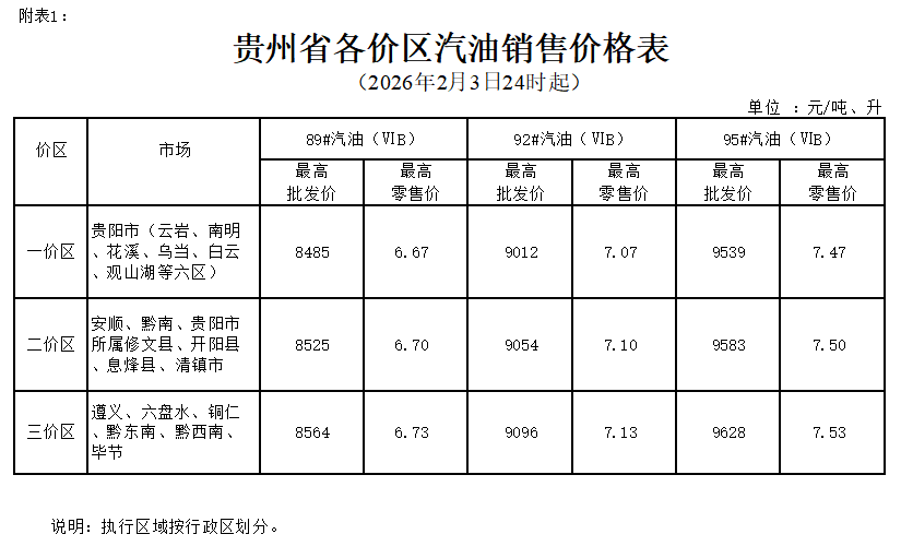 | | | | | | | | 单位 :元/吨、升 | | --- | --- | --- | --- | --- | --- | --- | --- | | | 市场 | 89#汽油(VIB) | | 92#汽油(VIB) | | 95#汽油(VIB) | | | | | 最高 | 最高 | 最高 | 最高 | 最高 | 最高 | | | | 批发价 | 零售价 | 批发价 | 零售价 | 批发价 | 零售价 | | | 贵阳市(云岩、南明 、花溪、乌当、白云 、观山湖等六区) | 8280 | 6. 51 | 8795 | 6. 90 | 9310 | 7. 29 | | | 安顺、黔南、贵阳市 所属修文县、开阳县 、息蜂县、清镇市 | 8320 | 6. 54 | 8837 | 6. 93 | 9354 | 7. 32 | | 三价区 | 遵义、六盘水、铜仁 、黔东南、黔西南、 毕节 | 8359 | 6.57 | 8879 | 6. 96 | 8636 | 7. 36 | | 价区 一价区 二价区 | | | | | | | | 1月20日,贵州省发展改革委发布消息,根据成品油价格形成机制,国家发展改 ...
