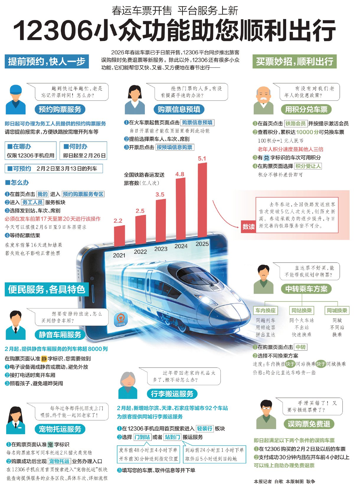 2026年春运车票已于日前开售,12306平台同步推出旅客误购限时免费退票等新服务。除此以外,12306还有很多小众功能,它们能帮您又快、又省、又方便 地在春节出行—— �购票成功后出现 宠物托运 业务办理入口 在 12306手机应用首页搜索进入"宠物托运"板块 能查询提供服务的业务区段、具体车次、详细流程 € 填写您的车票、取件信息等并下单 ----------- www.ara I Y Y 开车前30分钟送到指定位置 取件后5小时送到目的地 ଥ支付成功30分钟内目在开车前 可以线上自助办理免费退票 本报记者 白歌 本版制图 耿争 母名则崇旅各可同年代延乙六 猫大英龙彻 ...