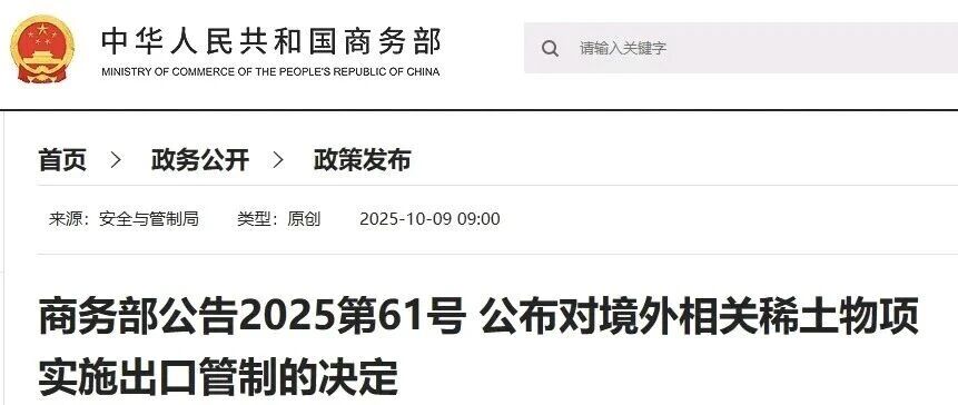 来源:本文转载自商务部网站 。 " 10月9日,据商务部网站消息: 商务部公告2025第61号 公布对境外相关稀土物项实施出口管制的决定 如果您希望可以时常见面,欢迎标星收藏哦~ 为维护国家安全和利益,根据《中华人民共和国出口管制法》《中华人民共和国两用物项出口管制 条例》等法律法规相关规定,经中国国务院批准,决定采取以下出口管制措施: 一、境外组织和个人(以下称"境外特定出口经营者")在向中国以外的其他国家和地区出口以下物 项前,必须获得中国商务部颁发的两用物项出口许可证件: (一)含有、集成或者混有原产于中国的本公告附件1第一部分所列物项在境外制造的本公告附件1第 二部分所列物项,且附件1第一部分所列物项占境外制造的附件1第二部分所列物项的价值比例达到 0.1%及以上的; (二)使用原产于中国的稀土开采、冶炼分离、金属冶炼、磁材制造、稀土二次资源回收利用相关技 术在境外生产的本公告附件1所列物项; (三)原产于中国的本公告附件1所列物项。 二、对向境外军事用户的出口申请,以及向出口管制管控名单和关注名单所列的进口商和最终用户 (包括其控股50%及以上的子公司、分公司等分支机构)的出口申请,原则上不予许可。 ...