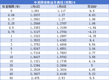 转自:新华财经 2026年1月9日,中债国债到期收益率1年期、2年期、3年期、5年期、7年期、10年期、30年期、50年期较1月4日分别变动-4.35BP、 8.4BP、8.54BP、3.04BP、2.77BP、3.55BP、4.95BP、5.5BP。 新华财经北京1月12日电(王柘)上周(2026年1月5日至1月9日)债市在多重利空压力下迎来剧烈调整,权益和商品市场联袂上行,沪 指站上4100点,通胀数据温和回升,对政府债券发行规模和期限的担忧也在开年得到验证,央行公告买债规模不及预期,基金年末冲量 行为更加剧了短期抛压。10年期国债收益率周初连续三个交易日上行,逼近1.90%一线后方有所企稳。同时,债市短端亦走出补跌行 情,收益率曲线整体平坦化上移。 | | | 中债国债收益率曲线(到期)8 | | | --- | --- | --- | --- | | 标准期限(年) | 1月4日 | 1月9日 | 受动BP | | 0 | 1.051 | 1.117 | 6.6 | | 0.08 | 1.2037 | 1.27 | 6.63 | | 0. 17 | 1.2501 | 1.27 | 1.99 | | 0 ...