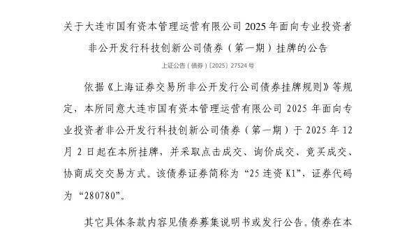 12月1日,上交所发布关于大连市国有资本管理运营有限公司2025年面向专业投资者非公开发行科技创 新公司债券(第一期)挂牌的公告。 依据《上海证券交易所非公开发行公司债券挂牌规则》等规定,上交所同意大连市国有资本管理运营有 限公司2025年面向专业投资者非公开发行科技创新公司债券(第一期)于2025年12月2日起在上交所挂 牌,并采取点击成交、询价成交、竞买成交、协商成交交易方式。该债券证券简称为"25连资K1",证 券代码为"280780"。 来源:市场资讯 ...