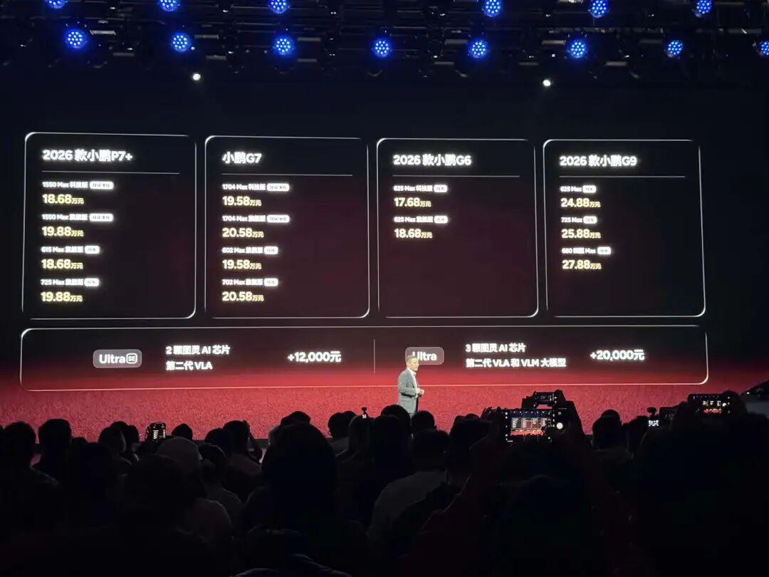 文|财天COVER 董雪 编辑 | 田梦 1月8日,在2026小鹏全球新品发布会上,小鹏汽车一口气发布了2026款小鹏P7+、小鹏G7超级增程、 2026款小鹏G6及2026款小鹏G9四款重磅车型。 这也是继小鹏X9超级增程后,该公司在增程产品线上再添新成员。 据了解,小鹏第二代VLA去掉了"语言转译"环节,实现从视觉信号到动作指令的端到端直接生成。在何 小鹏看来,2026年将是高阶智能驾驶在全球市场全面竞技的元年,也是中国和美国迎来真正全自动驾驶 的元年。 2026款小鹏P7+提供纯电和增程两种动力形式,官方指导价为18.68万~19.88万元。作为超级增程家族 的首款SUV,2026款小鹏G7分为纯电和增程4个版本,官方指导价为19.58万~20.58万元。 2026款小鹏G6仍为纯电车型,官方指导价为17.68万~18.68万元。2026款小鹏G9也只有3个纯电版本, 官方指导价为24.88万~27.88万元。 对于增程产品,小鹏采取的是"大电池+大油箱+超快充"策略。2026款小鹏P7+和2026款小鹏G7纯电续航 里程都是430km,前者综合续航里程为1550km,后者达到1704km,均搭载5C超 ...