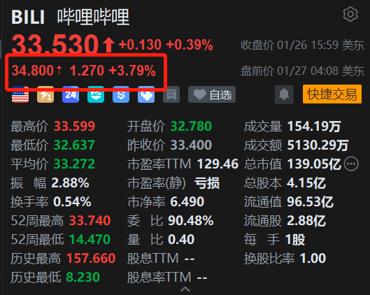 美股异动丨哔哩哔哩盘前涨3.8% 官宣新IP“2026 bilibili大年初一联欢会”