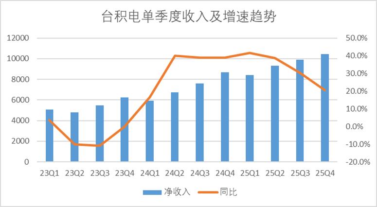 Core Viewpoint - TSMC's Q4 2025 financial report shows strong performance with revenue of NT$1.05 trillion, exceeding analyst expectations, and a gross margin of 62.3%, significantly higher than the forecasted 60.6% [5][10]. Financial Performance Summary - TSMC's revenue for Q4 2025 reached NT$1.05 trillion, surpassing the expected NT$1.02 trillion, with a net profit of NT$505.7 billion, also above the predicted NT$475.2 billion [5][10]. - The gross margin for Q4 2025 was 62.3%, up from 60.6% forecasted, indicating strong profitability [5][10]. - The average selling price for 12-inch equivalent wafers reached a record high of NT$264,100, reflecting a 9% quarter-over-quarter increase [16][18]. Product and Market Insights - TSMC's advanced process technology, particularly the 3nm process, continues to drive revenue growth, with 3nm products accounting for 28% of revenue in Q4 2025, up 5 percentage points from the previous quarter [10][16]. - The smartphone segment saw an 11% growth in Q4, while high-performance computing (HPC) grew by 4%, indicating a shift in demand dynamics [11][19]. - TSMC's capital expenditure for 2026 is projected to be between $52 billion and $56 billion, with 70%-80% allocated to advanced process capacity to support AI demand [24][26]. Cost Structure and Efficiency - TSMC's cost structure has improved, with a period expense ratio of 8.4%, the lowest in five years, and a depreciation rate significantly reduced to around 15% [30][32]. - The company has seen a decrease in accounts receivable turnover days by 26 days and inventory turnover days by 8 days, indicating enhanced operational efficiency [30][32]. Future Outlook - TSMC is optimistic about the AI market, with expectations of continued strong demand for advanced processes, potentially leading to a gross margin exceeding 65% by 2026 [12][15]. - The company is preparing for the introduction of 2nm products, which is expected to further solidify its market position and profitability [9][10].