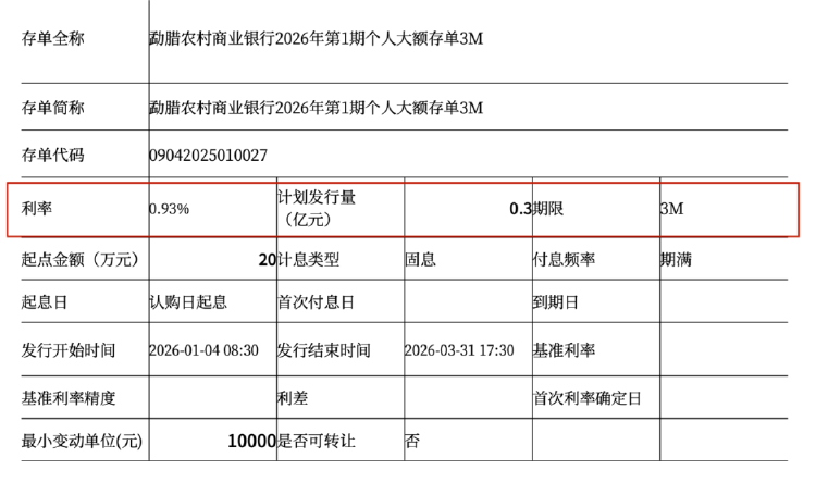【导读】部分中小银行3个月大额存单利率跌破1% 2026年开年,存款市场再迎新变化。中国基金报记者发现,以"高息揽储"著称的中小银行已率先开启"降息"步伐,并有部分银行的3个月大额存单利率进 入"0字头"。 业内人士认为,下调高息存款利率是银行应对净息差收窄、维持稳健经营的必然选择。"存钱躺赚"的时代即将成为过去式,个人投资者需要改变理财思 维,通过多元资产配置,从"追求绝对高息"转向"构建收益风险比最优的组合"。 还有多家农商行的3个月存单利率仅略高于1%。例如,"巢湖农村商业银行对私大额存单3个月-2026年第0001期"起存金额为20万元,利率为1.1%。"衡南 农商银行个人大额存单2026年1期3M"起存金额为20万元,利率为1.1%。"弥勒农村商业银行2026年第3期个人大额存单3M"起存金额20万元,利率为 1.05%。 此外,淮北农村商业银行针对机构发行的"淮北农商银行3个月期限单位大额存单2026年第1期",起存金额为1000万元,利率也仅为1%。 多重因素导致利率下调,"存钱躺赚"时代将结束 部分农商行3个月大额存单利率跌破1% 开年以来,多家中小银行相继下调了存款利率。例如,安徽新安银行宣 ...