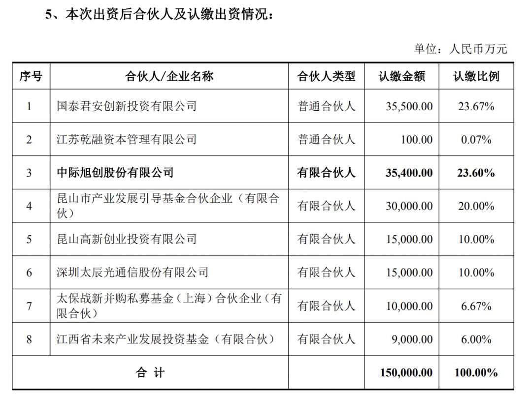 投资界-解码LP获悉,近日,中际旭创股份有限公司(简称"中际旭创")宣布参投国泰海通中际旭创产业基金。基金总规模15亿元,其中,中际旭创拟以 自有资金 认缴出资3.54亿元,为该基金最大LP。 大家对中际旭创一定不陌生——这是今年市场上最受关注的上市公司之一,早年由中际装备和苏州旭创合并而来,如今乘上AI东风,四个月股价翻了三 倍,最新市值超4600亿。 | | | | 序号 | 合伙人/企业名称 | 合伙人类型 | 认缴金额 | 认缴比例 | | --- | --- | --- | --- | --- | | 1 | 国泰君安创新投资有限公司 | 普通合伙人 | 35,500.00 | 23.67% | | 2 | 江苏乾融资本管理有限公司 | 普通合伙人 | 100.00 | 0.07% | | 3 | 中际旭创股份有限公司 | 有限合伙人 | 35,400.00 | 23.60% | | 4 | 昆山市产业发展引导基金合伙企业(有限合 伙) | 有限合伙人 | 30,000.00 | 20.00% | | રે | 昆山高新创业投资有限公司 | 有限合伙人 | 15.000.00 | 10.00% | ...