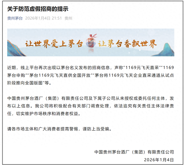 新浪财经"酒价内参"重磅上线 知名白酒真实市场价尽在掌握 微信公众号"贵州茅台"1月4日发布关于防范虚假招商的提示: 近期,线上平台再次出现以茅台名义发布的招商信息,声称"1169元飞天直采""1169茅台申购""茅台 1169元飞天直供全国开放""茅台将1169元飞天企业直采通道从试点阶段推向全国版图"等。 中国贵州茅台酒厂(集团)有限责任公司及下属子公司从未授权或委托任何主体,发布以上信息。我公 司将积极配合有关部门调查处理,依法追究有关责任主体法律责任,切实维护市场秩序和消费者权益。 本文系观察者网独家稿件,未经授权,不得转载。 日前,贵州茅台官宣500ml飞天茅台将正式上线i茅台,被业内认为是茅台市场化转型的一个标志性动 作。 2026年1月1日9时,规格为53度/500ml的2026年飞天茅台(下称"新飞天")在i茅台APP上正式开售,售 价为1499元/瓶,每位用户每日最多可购买12瓶。据贵州茅台发布的消息,每日投放量会综合考虑防止 炒作、供需适配和市场稳定确定,当日售完即止。之后,每日上午9时准点开售。 当天上午9时开售后,新飞天"秒空",之后每5分钟放货一次,且多轮补货均售罄。 随后,"小茅i ...
