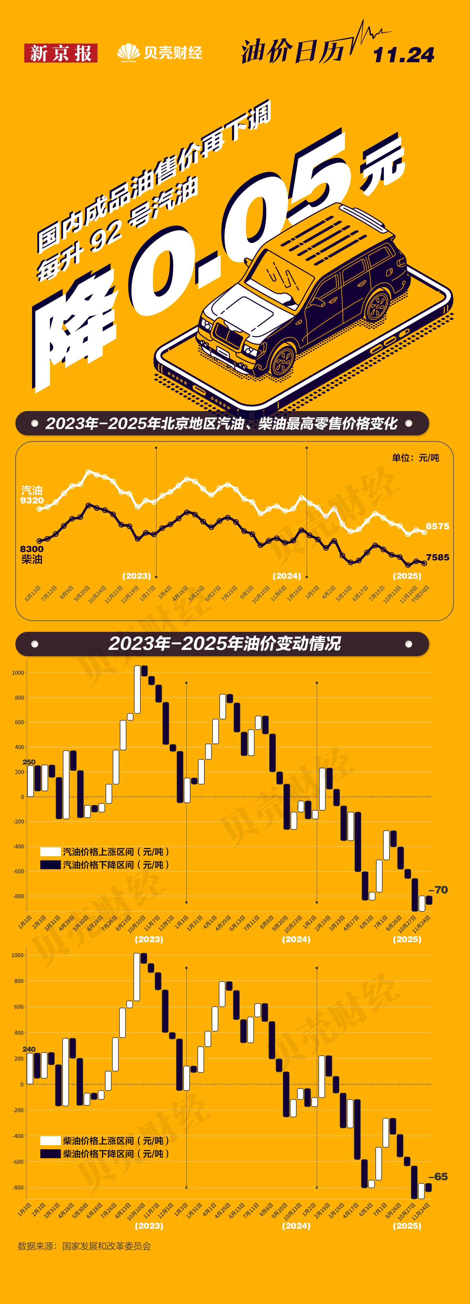 来源:智通财经 国内成品油价迎年内第十次下调。 11月24日,国家发改委发布消息称,自24时起,国内汽油价格和柴油价格分别下调70元/吨和65元/吨。 折合升价,92号汽油下调0.05元,95号汽油和0号柴油均下调0.06元。 此次调价后,私家车和物流企业用油成本均有所下降。 按照油箱容量为50L的家用轿车为例,加满一箱92号汽油将节省2.5元;对于月跑1万公里,百公里油耗 在38L的重型卡车为例,在下次调价窗口开启前,单辆车的燃油成本将减少106元左右。 她分析指出,后期来看,未来东欧和谈有望降低石油供应担忧,国际贸易争端与产业过剩预期的大背景 下,油市或承压偏弱运行,下轮存在"二连跌"可能。 本轮是2025年第二十三次调价,也是今年的第十次下调。本次调价过后,2025年成品油调价将呈现"三 涨五跌两搁浅"的格局。 本轮调价后,全国大多数地区车柴价格6.5-6.7元/升,92号汽油零售限价在6.8-6.9元/升。 本计价周期以来,国际原油未走出单边行情,整体呈现宽幅波动走势。受此影响,国内参考的原油变化 率始终在负值范围内波动。 卓创资讯成品油分析师高青翠分析指出,市场传出美国将和欧洲某国举行和谈,受到此消 ...