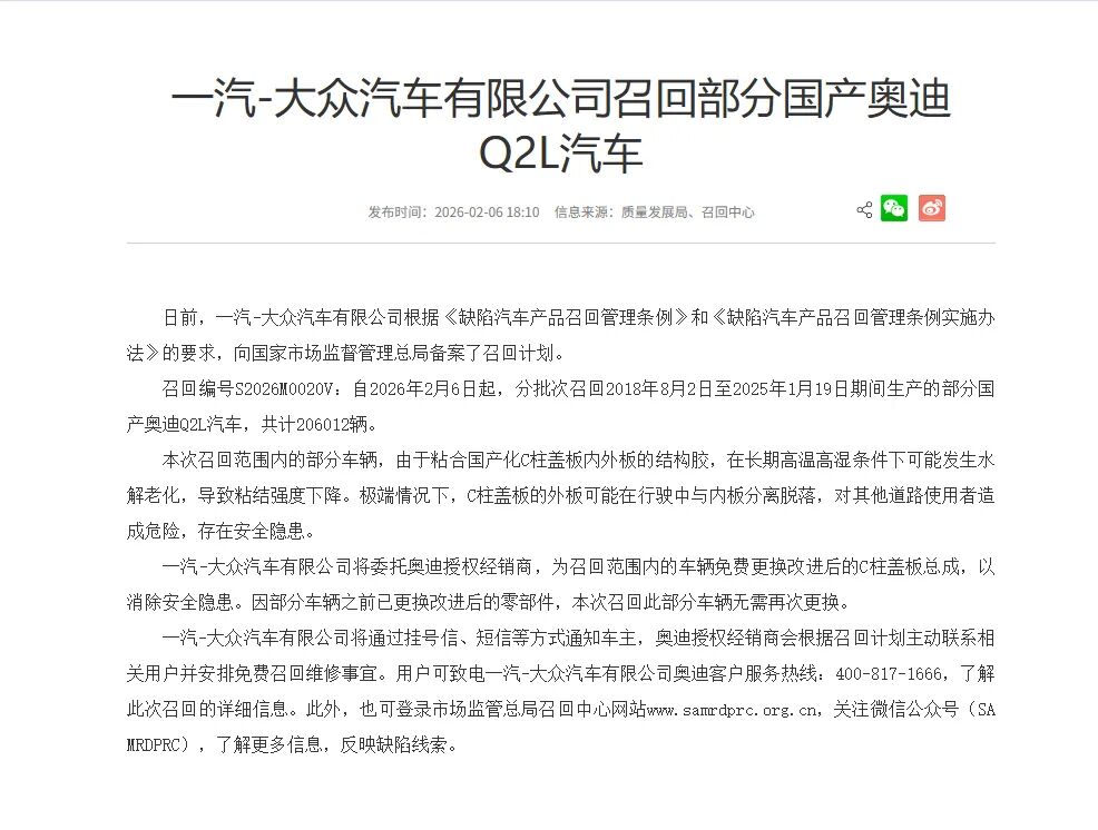 近日,一汽-大众汽车有限公司正式启动大规模召回计划,涉及2018年8月2日至2025年1月19日期间生产的部分国产奥迪Q2L汽车,累计数量 达20.6万辆。这一召回计划已通过国家市场监督管理总局备案,依据《缺陷汽车产品召回管理条例》及实施办法执行。 召回公告显示,缺陷根源在于国产化C柱盖板内外板的粘合结构胶存在耐久性缺陷。在长期高温高湿环境下,该结构胶可能发生水解老化, 导致粘结强度下降,极端情况下C柱外板可能在行驶中脱落,对道路交通安全构成隐患。 C柱作为车身后部连接车顶与车尾侧围的关键结构,其外盖板总成由内板、外板通过结构胶粘合及卡扣固定组成,本次召回将为相关车辆免 费更换采用抗水解结构胶的改进版总成,已更换过改进部件的车辆无需重复处理。 值得注意的是,该缺陷并非突发。第三方投诉平台车质网数据显示,截至召回公告发布前,已累计受理408宗相关投诉,涉及2018款至2021 款多个年型车辆,车主反馈问题集中于C柱饰板自然松动、开胶及行驶中脱落,部分车主曾遭遇高速行驶时盖板脱落的险情。 召回事件的发生,正值奥迪全球经营面临挑战的关键节点。根据奥迪官方发布的2025年业绩数据,公司全年全球销量162.36万辆,同 ...