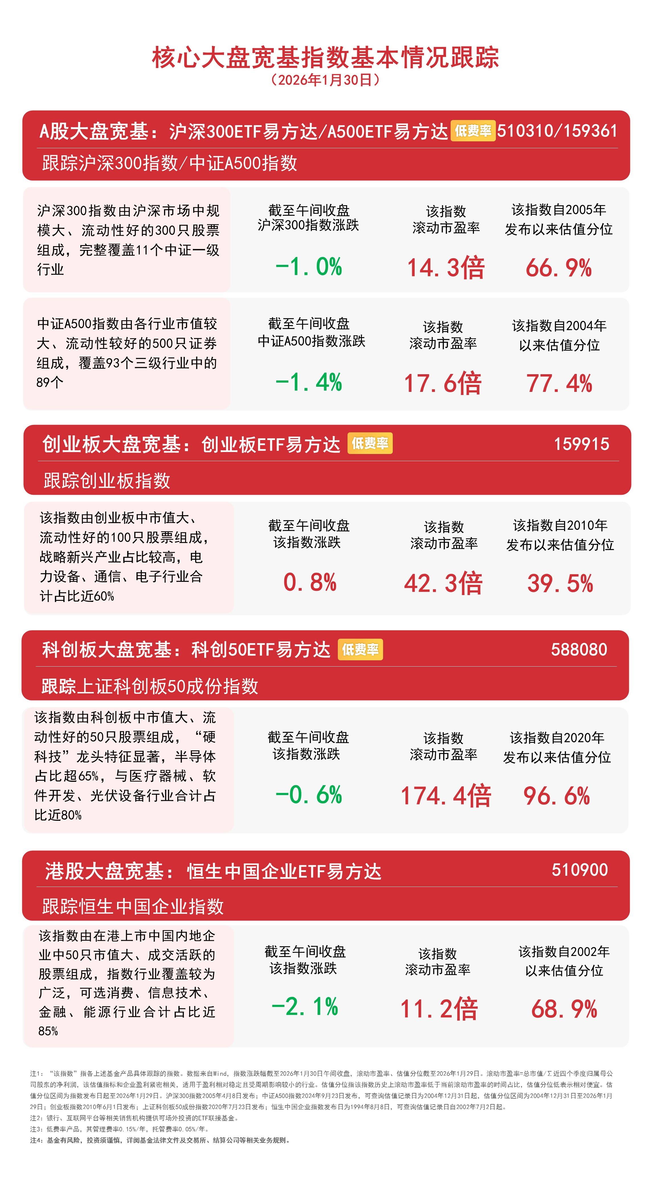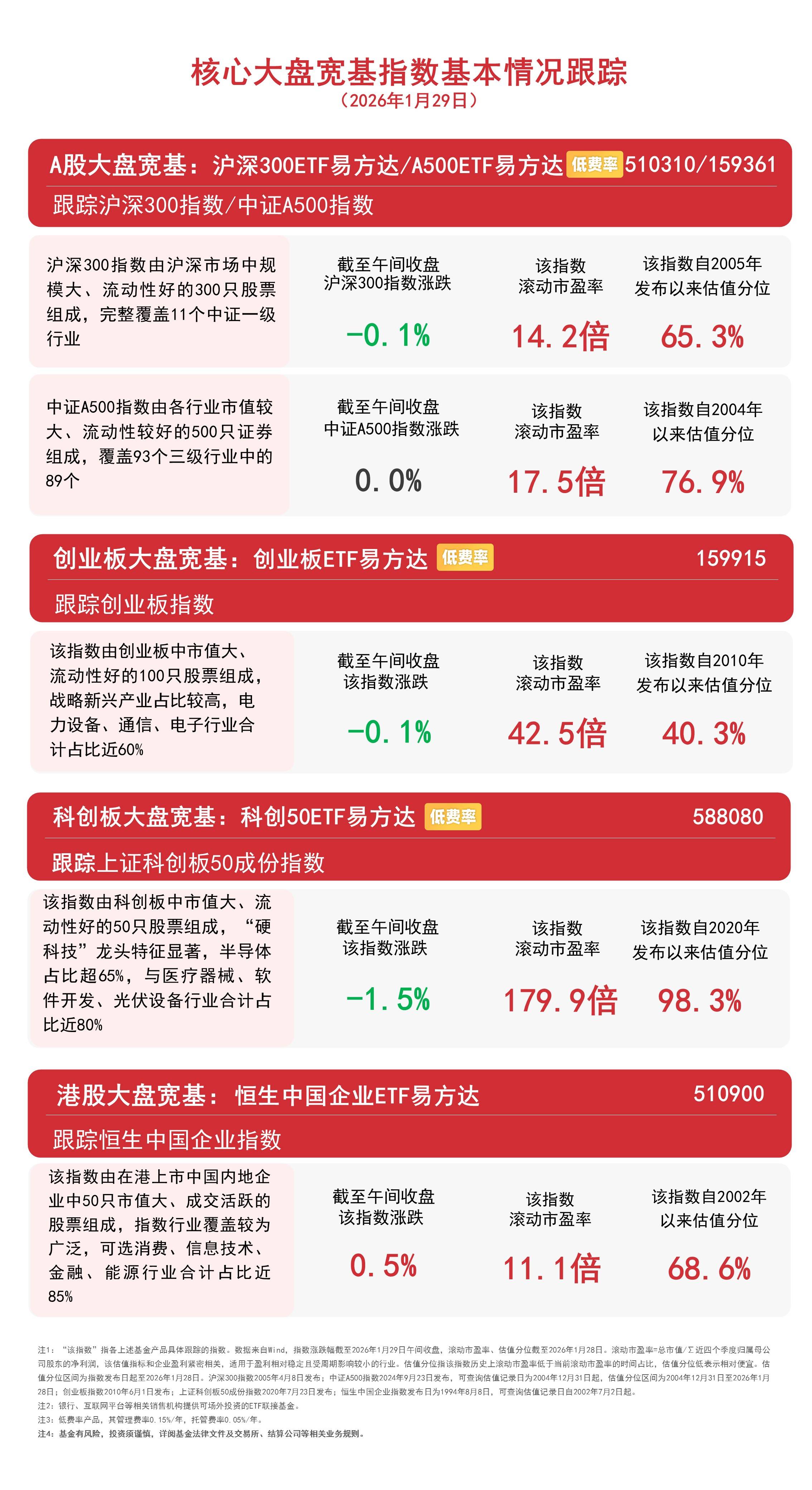 1月27日早盘,A股三大指数涨跌不一,沪指半日涨0.03%,全市场成交额约1.9万亿元。板块题材上,黄金、有色金属、石油天然气、能源设备板块涨幅居 前,餐饮旅游、航空、白酒等板块跌幅居前;港股走强,大会融板块集体走强,钢铁、建筑板块跌幅居前。截至午间收盘,中证A500指数上涨0.01%,沪深 300指数上涨0.3%,创业板指数上涨0.4%,上证科创板50成份指数上涨0.6%,恒生中国企业指数上涨0.9%。 核心大盘宽基指数基本情况跟踪 (2026年1月27日) A股大盘宽基:沪深300ETF易方达/A500ETF易方达 佩费率 跟踪沪深300指数/中证A500指数 沪深300指数由沪深市场中规 模大、流动性好的300只股票 组成,完整覆盖11个中证一级 行业 截至午间收盘 沪深300指数涨跌 该指数 滚动市盈率 14.1倍 中证A500指数由各行业市值较 大、流动性较好的500只证券 组成,覆盖93个三级行业中的 89个 截至午间收盘 中证A500指数涨跌 42.6倍 科创板大盘宽基:科创50ETF易方达 0. 0% 该指数 滚动市盈率 17. 4倍 创业板大盘宽基:创业板ETF易方达 低费率 跟踪创业板指数 ...