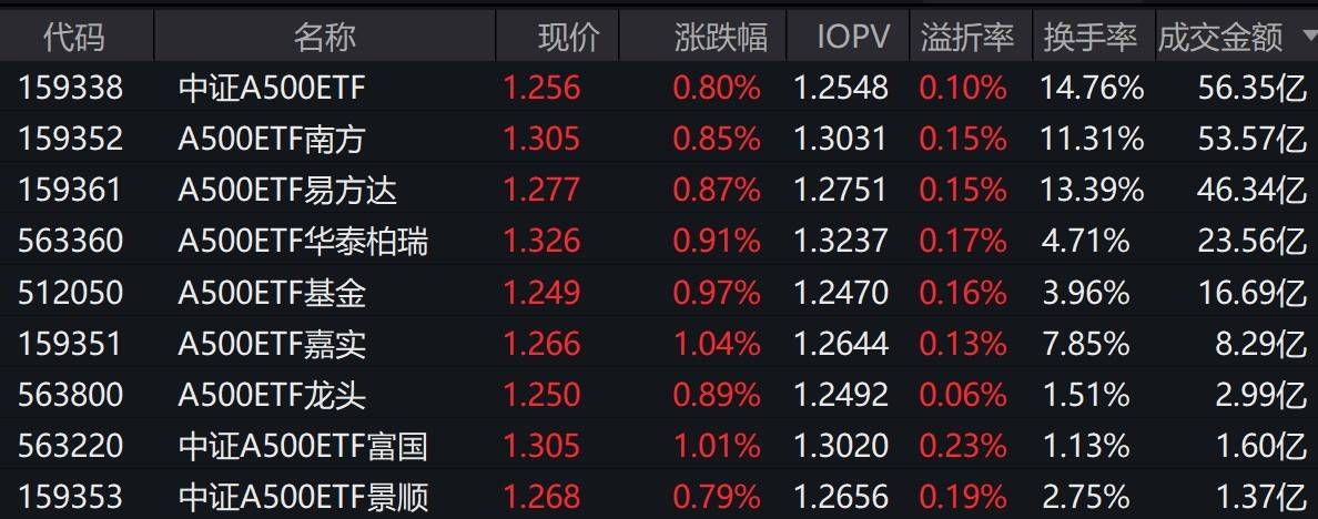 市场早盘走势分化,三大指数涨跌不一,中证A500指数下跌0.08%。从板块来看,商业航天概念反复活跃,机器人概念走强,造纸概念爆发;下跌方面, 贵金属概念跌幅居前。 | 代码 | 名称 | 现价 | 涨跌幅 | IOPV 溢折率 换手率 成交金额 ▼ | | | --- | --- | --- | --- | --- | --- | | 563360 | A500ETF华泰柏瑞 | 1.256 | -0.08% | 1.2554 0.05% 16.10% 75.24亿 | | | 512050 | A500ETF基金 | 1.182 | -0.08% | 1.1819 0.01% 17.95% 67.33亿 | | | 159338 | 中证A500ETF | 1.189 | -0.17% | 1.1896 -0.05% 12.05% | 44.76亿 | | 159352 | A500ETF南方 | 1.236 | -0.16% | 1.2357 0.02% 9.23% | 41.27亿 | | 159361 | A500ETF易方达 | 1.210 | 0.00% | 1.2097 0.02% 11.93 ...