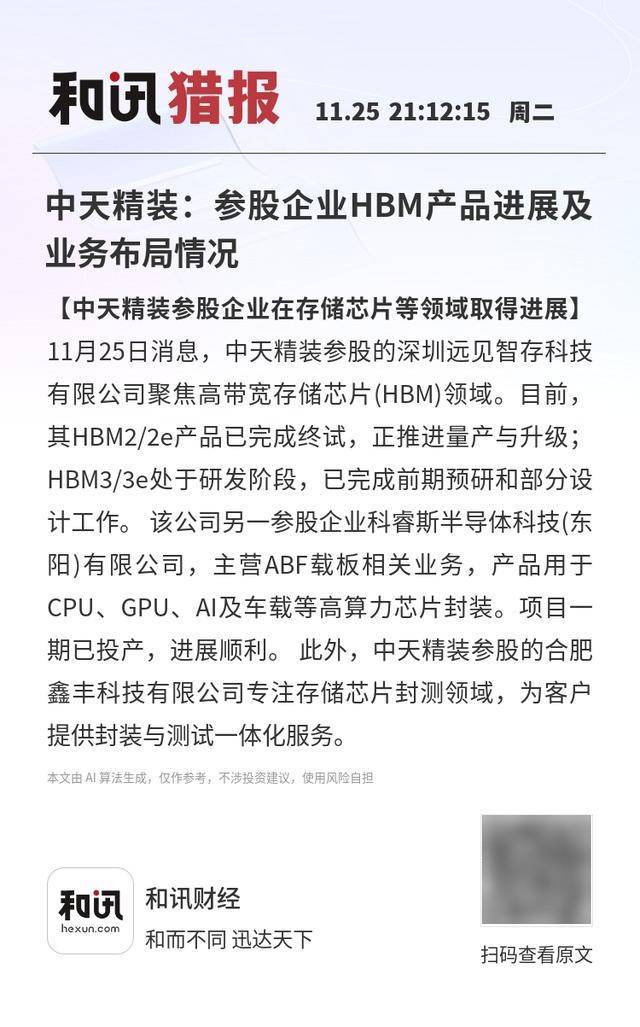 【中天精装参股企业在存储芯片等领域取得进展】11月25日消息,中天精装参股的深圳远见智存科技有 限公司聚焦高带宽存储芯片(HBM)领域。目前,其HBM2/2e产品已完成终试,正推进量产与升级; HBM3/3e处于研发阶段,已完成前期预研和部分设计工作。 该公司另一参股企业科睿斯半导体科技(东 阳)有限公司,主营ABF载板相关业务,产品用于CPU、GPU、AI及车载等高算力芯片封装。项目一期 已投产,进展顺利。 此外,中天精装参股的合肥鑫丰科技有限公司专注存储芯片封测领域,为客户提 供封装与测试一体化服务。 本文由 AI算法生成,仅作参考,不涉投资建议,使用风险自担 和闭猎报 11.25 21:12:15 周= 本文由 Al 算法生成,仅作参考,不涉投资建议,使用风险自担 和讯财经 和而不同 迅达天下 扫码查看原文 中天精装:参股企业HBM产品进展及 业务布局情况 【中天精装参股企业在存储芯片等领域取得进展】 11月25日消息,中天精装参股的深圳远见智存科技 有限公司聚焦高带宽存储芯片(HBM)领域。目前, 其HBM2/2e产品已完成终试,正推进量产与升级; HBM3/3e处于研发阶段,已完成前期预研和部分设 ...