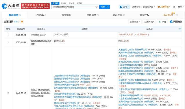 人民财讯11月25日电,企查查APP显示,近日,深圳像素绽放科技有限公司发生工商变更,新增北京市 人工智能产业投资基金(有限合伙)等为股东,同时注册资本增至333.057万元。公开信息显示,像素绽放 是一家AI办公工具研发商。 ...
