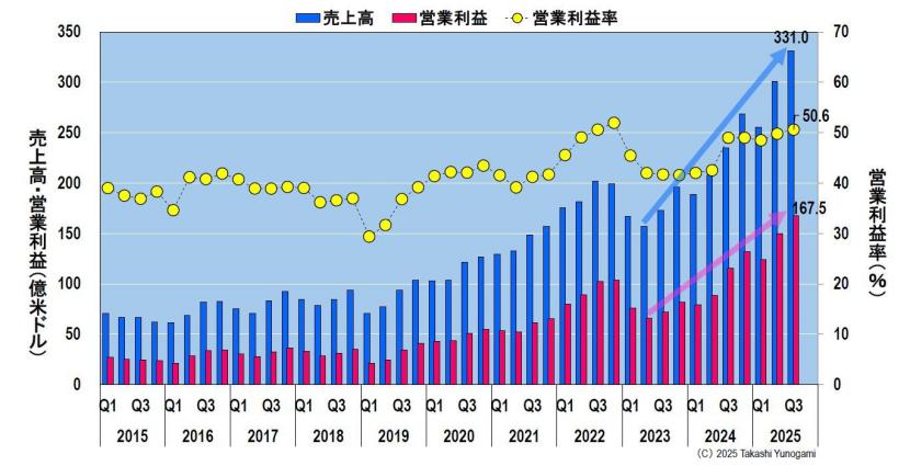 Core Insights - TSMC reported record-high sales of $33.1 billion and operating profit of $16.75 billion for Q3 2025, with an operating margin recovering to over 50% [1][3] - TSMC's wafer shipments reached a record 4.09 million in Q3 2025, indicating a V-shaped recovery from a low of 2.9 million in Q3 2023 [5][7] Financial Performance - TSMC's Q3 2025 sales of $33.1 billion positioned it as the second-largest semiconductor company, following NVIDIA's $46.7 billion [3][5] - The operating profit margin has rebounded from a previous low of around 40% to over 50% [1] Wafer Shipments - TSMC's wafer shipments peaked at 3.97 million in Q3 2022, fell to 2.9 million in Q3 2023, and then rose to 4.09 million in Q3 2025 [5][7] - The increase in wafer shipments is attributed to strong demand for advanced 3nm and 5nm nodes, while the 7nm process remains underutilized [7][19] Technology and Market Dynamics - TSMC's strong performance is driven by rapid growth in wafer input for 3nm and 5nm nodes, as Chinese semiconductor manufacturers shift focus to mature nodes due to U.S. restrictions [7][14] - The company has transitioned its core business from smartphone chips to artificial intelligence (AI) and high-performance computing (HPC) [21][24] Customer Base Evolution - TSMC's top customers have shifted from smartphone manufacturers to AI semiconductor companies, with NVIDIA expected to account for 22-25% of revenue by 2025, surpassing Apple [26][27] - The share of smartphone-related companies in TSMC's revenue has decreased significantly, indicating a structural shift in the customer base [27][28] Competitive Position - TSMC maintains a dominant position in the semiconductor industry, with over 157 EUV lithography machines, far exceeding competitors like Samsung and Intel [30][31] - The ability to supply advanced nodes has become a critical asset, likened to a new form of currency in the semiconductor market [33]