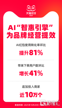 Core Insights - Tmall's AI "Smart Benefit Engine" has significantly improved operational efficiency for tens of thousands of merchants during this year's Double 11 shopping festival, leading to new growth opportunities [1][3] - The AI engine has driven a conversion rate increase of 81% from AI-generated red envelopes, with a 41% growth in the number of users placing orders [1][3] - The AI technology is not just a tool for efficiency but is directly contributing to brand growth by enhancing customer conversion rates, particularly among new and price-sensitive customers [3] Group 1 - Tmall invested 50 billion yuan in consumer vouchers and utilized the AI "Smart Benefit Engine" for decision-making on limited-time discounts [1] - The AI engine has been adopted by tens of thousands of brands across various industries, including apparel, beauty, 3C, home appliances, sports, food, and pet products [3] - The AI-driven approach has led to a significant increase in transaction volume, with some brands reporting over 80 million yuan in sales attributed to the AI engine [3] Group 2 - Tmall has implemented AI to intelligently organize its 2 billion product catalog, resulting in a 25% increase in purchasing efficiency through improved matching of products and consumers [4] - The AI integration covers nearly all aspects of brand management on Tmall, from operational analysis to audience engagement, saving merchants hundreds of billions in costs [4] - Brands utilizing AI are experiencing incremental growth and capturing the benefits of this technological advancement [4]