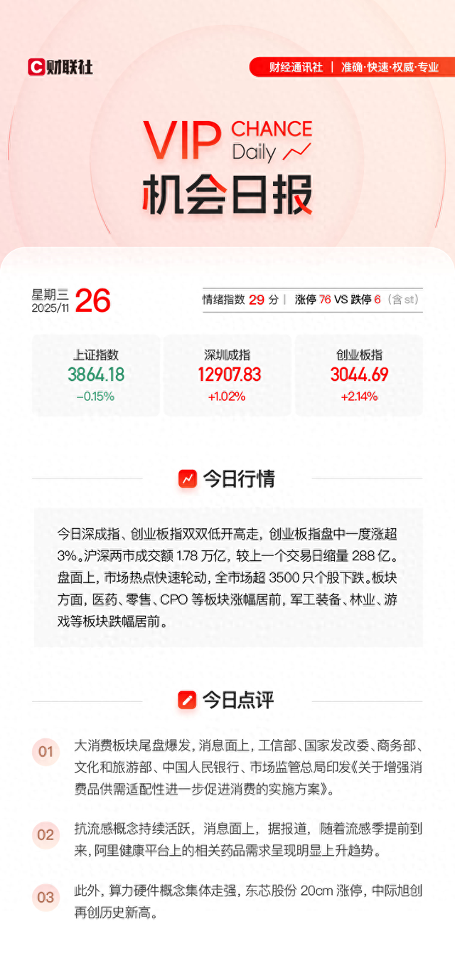 转自:智通财经 注:智通财经VIP为内容资讯产品,并非投资建议。以下内容仅为资讯价值展示非对相关公 司的推荐建议,非未来走势预测。投资有风险,入市需谨慎。 市场热点一 大消费 消息面上,工信部、国家发改委、商务部、文化和旅游部、中国人民银行、市场监管总局印发《关于增 强消费品供需适配性进一步促进消费的实施方案》。 《智通财经早知道》:今日复盘+明日前瞻,精选更有价值的交易资讯。 11月19日21:12《智通财经早知道》 追踪到OpenAI与Target携手将新的AI驱动体验带入零售领域,指出 机构称AI应用端正进入新的催化阶段,提及三江购物致力于打造互联网时代新零售的社区生鲜超市, 其在11月26日收获涨停。 三江购物(601116) 11-26 16:05:29 沪 融 所属行业:商贸零售 +1.72% > 查看所属板块 > 商业零售 阿里巴巴概念 +1.59 +10.00% +2.22% 最相关 +0.29% 72.9万手 今 开 成交量 15.88 最 高 17.49 昨 收 15.90 最 低 15.88 成交额 12.0亿 市盈动 换手率 总市值 95.8亿 62.75 13.31% 热股 11月1 ...