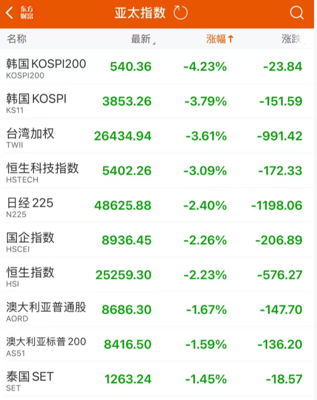 首先我们要明确,上周五的回调,并非仅仅是A股,而是全球都在调整,和老美关系密切的日韩,更是跌幅夸张,韩国的综指跌幅超过4%。 最近大A又开始给大家上难度了,尤其是上周五,全球大跌,A股也狠狠回调了一波。 很多人有焦虑上了,"行情是不是结束了"、"熊市又要来了"? 下面,海星君就和大家一起聊聊最新的行情吧~ | く 気 | 亚太指数 () | | Q | | --- | --- | --- | --- | | 名称 | 最新 | 涨幅↑ | 污长跌 | | 韩国 KOSPI200 | 540.36 | -4.23% | -23.84 | | KOSPI200 | | | | | 韩国 KOSPI | 3853.26 | -3.79% | -151.59 | | KS11 | | | | | 台湾加权 | 26434.94 | -3.61% | -991.42 | | TWII | | | | | 恒生科技指数 | 5402.26 | -3.09% | -172.33 | | HSTECH | | | | | 日经 225 | 48625.88 | -2.40% | -1198.06 | | N225 | | | ...