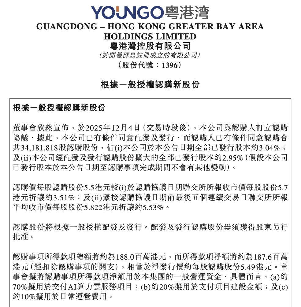 Core Viewpoint - Yuegangwan Holdings (stock code: 1396) announced a financing plan through the placement of new shares, raising approximately HKD 190 million for AI computing services and operational expenses [1] Group 1: Financing Details - The company will issue 34,181,818 new shares, raising about HKD 190 million, with net proceeds also around HKD 190 million after expenses [1] - The placement price of HKD 5.50 represents a discount of approximately 3.5% to the last closing price of HKD 5.70 and a discount of about 5.5% to the average closing price over the past five trading days [1] - The new shares will account for approximately 3.0% of the existing issued share capital and about 2.9% of the enlarged share capital post-issue [1] Group 2: Company Overview - Yuegangwan Holdings operates with a dual focus on infrastructure and AI business, providing AI computing technology services, constructing and developing AI computing centers, and operating these centers [1] - The funds raised will be allocated to the delivery of AI computing cloud services, project construction payments, and daily operational expenses [1]