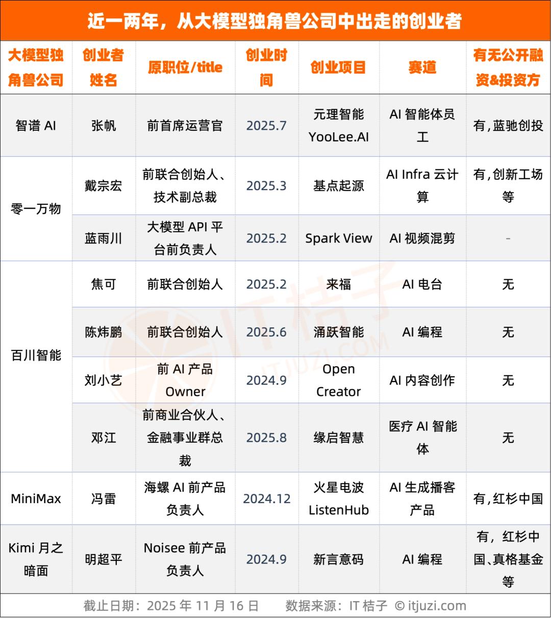在最近的一年多时间里,中国"大模型六小虎"几乎无一不在经历着相似的阵痛: ·通用大模型底座的故事难以再吸引资本继续投入,融资节奏明显放缓; ·C端收费难,商业化压力较大,更多转型ToB和ToG; ·战略及业务几经调整,带来的高管动荡,人事变更频繁。 内外震荡之下,连"六小虎"这个称号都鲜有人再提及——大模型创业领域的风,像是一阵龙卷风,来得快,去得也快。 据媒体报道,仅在今年上半年,智谱、MiniMax、零一万物等5家大模型公司被曝出至少12位高管离职,包括智谱前首席运营官张帆、MiniMax商业化合 伙人兼副总裁魏伟等。 这些离职的独角兽高管,有的跳槽去了字节跳动等大厂,有的暂未披露就业动向,还有的选择了再次创业。 在这其中,离职的高管创业者往往受到业界的关注,基于IT桔子数据库和公开资料,我们做了以下盘点。 | 大樓型車 | 创业者 | FF / title | SUNNING | SINDE | 襄垣 | 有无公开融 | | --- | --- | --- | --- | --- | --- | --- | | 角兽公司 | 姓名 | | | | | 资&投资方 | | 智谱 Al | 张帆 | ...