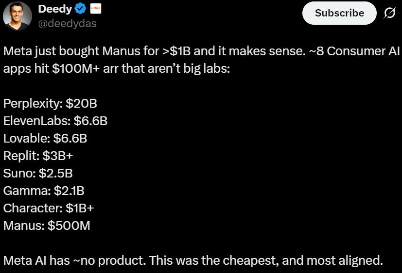 一场天价收购与一份"亿元ARR"名单,近日引起AI圈热议。 不久前,Manus被Meta以20亿美元的天价收购。在交易落锤前夕,Manus披露其年度经常性收入(ARR)已突破1亿美 元 (最新达1.25亿美元) ,以惊人的速度拿到了"1亿美元ARR俱乐部"的入场券。 Manus的爆发并非孤例。算上它,今年已有9家AI应用公司跻身这一顶尖俱乐部,其中包括AI编程领域的当红炸子鸡 Cursor、Lovable,以及AI搜索的明星公司Perplexity。 在这份名单中,比规模更具冲击力的,是它们增长的速度。 Lovable仅耗时8个月,Cursor用了12个月,Perplexity与ElevenLabs也分别只用了14和22个月。这些头部玩家,几乎一 半都在两年内完成了从0到1亿美元的跨越。 这背后是交付逻辑的根本转变。 这些商业化跑得最快的公司,无一例外都做对了一件事:不卖能力本身,而是直接卖结果。 例如,Perplexity和Replit并不直接出售"搜索能力"或"编程能力",而是出售可信结果的整合,以及应用的运行、托管 与交付。 这印证了一个关键趋势:当AI极大降低了代码、内容等领域的生产门槛,商业价值的核 ...