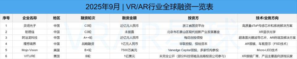 【VRAR星球原创稿件,未经许可禁止转载】 据 VRAR星球 不完全统计,2025 年 9 月,全球 VR/AR 领域共发生 6 起融资事件,披露融资数额约 2.172 亿美元(约合15.46亿人民币, 按1美元≈7.12人民币汇率估算)。 在全球范围内,有 2 起融资事件,比上月减少 3 起,融资金额约 1.75亿美元,比 8 月增长约 1.43亿美元,主要原因在于存在一笔 1 亿美 元大额融资。 | | | | | 2025年9月 VR/AR行业全球融资一览表 | | | | --- | --- | --- | --- | --- | --- | --- | | 序号 | 企业名称 | 地区 | 融资轮次 | 融资金额 | 投资方 | 技术/业务方向 | | | 灵明光子 | 中国 | C3轮 | 近亿元人民币 | 浙江省国资平台 | 高质量dToF传感芯片和系统解决方案 | | 2 | 耐德佳 | 中国 | C342 | 未披露 | 北京市石景山区现代创新产业发展基金 | XR显示光学 | | 3 | 阿法龙科技 | 中国 | A++轮 | 近亿元人民币 | 梅花创投领投 | 超表面光栅波导芯片、AR终 ...