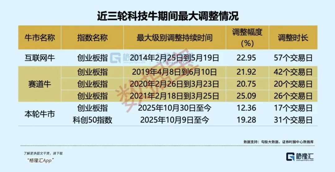 | | | 近三轮科技牛期间最大调整情况 | | | | --- | --- | --- | --- | --- | | 牛市名称 | 指数名称 | 最大级别调整持续时间 | 调整幅度 (%) | 调整时长 | | 互联网牛 | | 创业板指 = 2014年2月25日到5月19日 | 22.95 | 57个交易日 | | 塞道牛 | 创业板指 | 2019年4月8日到6月10日 | 21.92 | 42个交易日 | | | 创业板指 | 2020年2月26日到3月23日 | 20.75 | 20个交易日 | | | 创业板指 | 2021年2月18日到3月25日 | 25.09 | 26个交易日 | | 本轮牛市 | 创业板指 | 2025年10月30日至今 | 12.36 | 17个交易日 | | | 科创50指数 | 2025年10月9日至今 | 19.28 | 31个交易日 | | 了解更多图文干货,请下载 "格隆汇App" | | | | | 一边喊"泡沫要破了",说AI就是资本堆出来的概念,烧钱无数却没见多少真赚钱的业务,甚至 杜撰出英伟达庞氏骗局;另一边怼"格局小了",坚信AI是下一次生产力革命, ...