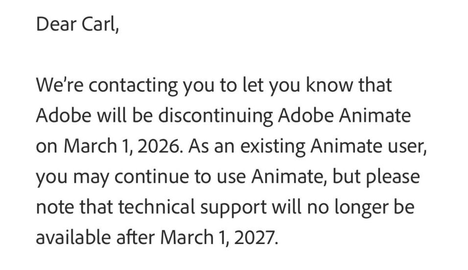 As Adobe ramps up its investments in AI, the company has decided to shut down its 2D animation software, Adobe Animate. On Monday, Adobe issued an update to the company’s support site and sent emails to existing customers announcing Adobe Animate will be discontinued on March 1, 2026.Enterprise customers can continue to receive technical support through March 1, 2029, to ease the transition. Other customers will have support through March of next year, the company said. The decision has been met with incre ...