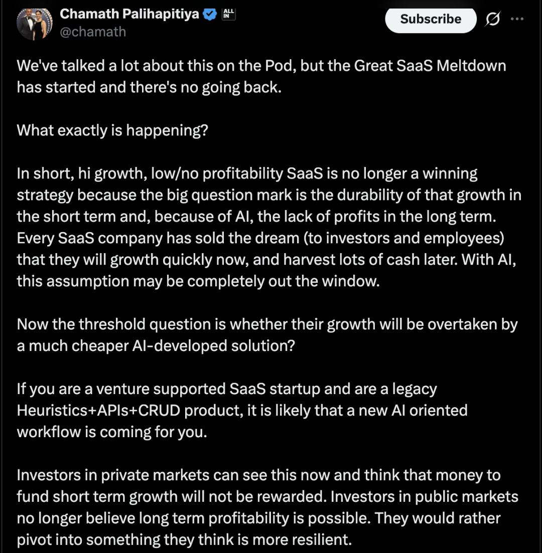 这周二,SaaS、数据和软件类投资公司的市值蒸发了约 3000 亿美元。这并非因为盈利不及预期或宏观经济冲击,而是因为一款人工智能产品发布。 这场危机已经持续数月。等到市场做出反应时,IGV 软件指数已较 9 月下旬的峰值下跌了约 30%。上周发生变化的不是方向,而是速度。 几家根基深厚的企业软件公司股价在一天之内大幅下跌。Salesforce、ServiceNow、Adobe 和 Workday 的股价均下跌约 7%。Intuit 的股价更是暴跌近 11%。与此同时,整个行业的估值倍数也急剧下降。软件公司的平均预期市盈率在短短几个月内从约 39 倍暴跌至约 21 倍。做空者已通过押注传统 SaaS 业务在 2026 年获利超过 200 亿美元,并且还在加倍下注。 除非核心假设被打破,否则市场不会抹去如此巨大的价值。 1 纳德拉判断 SaaS 已死 在过去二十年的大部分时间里,企业软件受益于异常稳定的经济形势。软件开发成本高昂,转换成本也很高,数据都存储在专有系统中。 一旦某个平台成为记录系统,它便会一直占据这一位置。这种信念支撑着从公开市场估值倍数到私募股权收购再到私募信贷承销等方方面面。经常性收入 被视为 ...